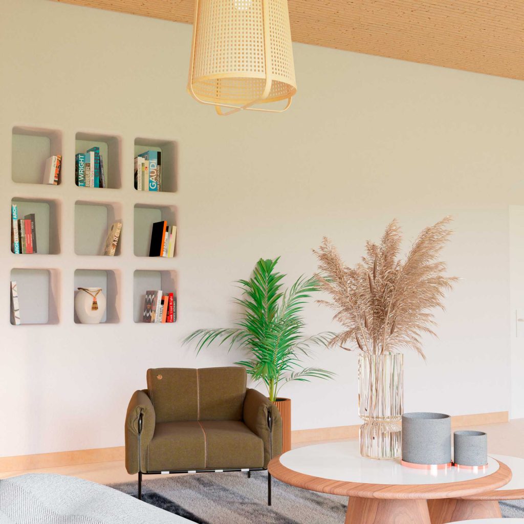 Ambientación con mobiliario moderno, colores y texturas que generan armonía.